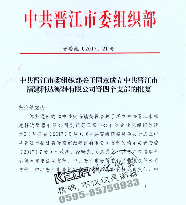 同意成立中共晉江市福建科達(dá)衡器有限公司支部的批復(fù)