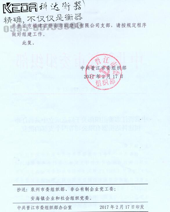 你委送來的《中共安海鎮(zhèn)委員會(huì)關(guān)于成立中共晉江市福建科達(dá)衡器有限公司支部等三家非公有制企業(yè)黨組織的請式》